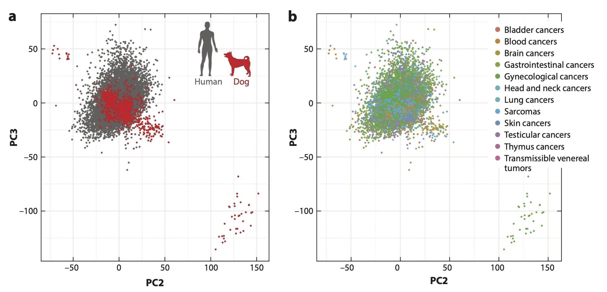 下图来自 Annual Review of Biomedical Data Science(2024)期刊论文,基于人与宠物共有的不同肿瘤类型的转录组学(transcriptomics)研究与结果统计数据,左图,灰点表示人类不同恶性肿瘤的统计数据,红点表示宠物犬不同恶性肿瘤的统计数据。从左图可知,相当多的人与宠物犬恶性肿瘤有着近似的转录组学表现,灰点红点的重叠率是挺高的。而右图,再细分不同恶性肿瘤类型,从膀胱癌到传染性肿瘤约十二种类型,配合左图解析能知道很多常见、少见与罕见恶性肿瘤在人与宠物的生物表现上竟然是如此相似(点重叠)!