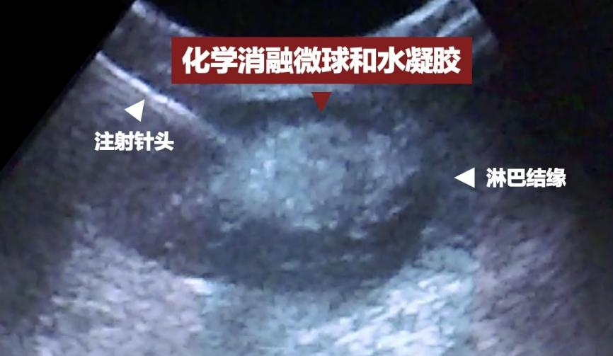 下图是一例犬肿瘤近端转移至肿瘤引流淋巴结的病例。主治医师以超声导引常规注射器注射化学消融(载药微球+水凝胶)进入肿瘤引流淋巴结的影像。因为淋巴结的袋状结构,注射入的化学消融载药微球与水凝胶能高度停留于淋巴结内缓释携载的治疗药品,达到微创介入局部治疗的临床效益。