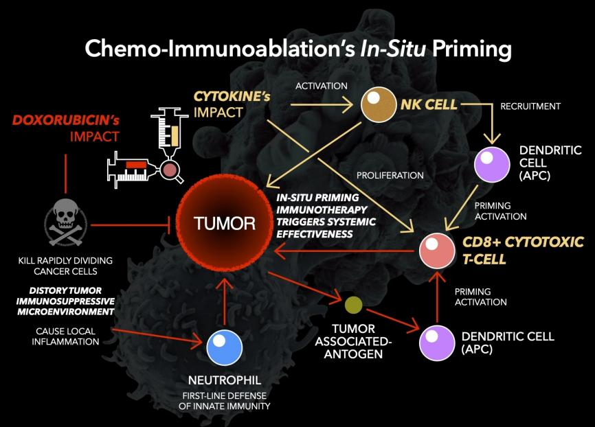 化学消融除了大家习知能携载治疗药品外,还能额外携载细胞介质(Cytokine),达到双核弹头的攻击能力!第一个核弹头是:化学消融微球携载多柔比星毒杀肿瘤细胞、释放肿瘤特有的抗原(TAA, timor associated antigen)、破坏肿瘤微环境,为其后的细胞治疗斩荆披棘硬生生开出一条大路,如下图左部 Doxorubicin’s Impact。